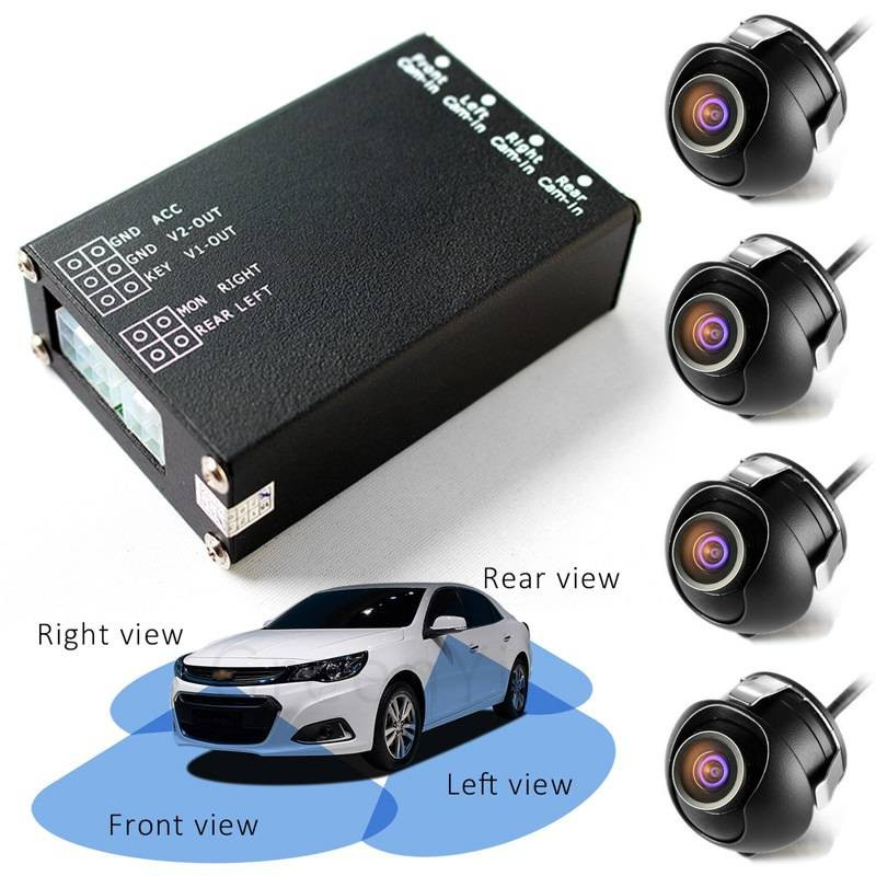 Are 4 intrari video de la 4 camere. O camera de pe spate, o camera de pe fata si 2 camere de pe lateral. Camerele pot fi plasata si in alte pozitii in functie de dorintele clientului.
