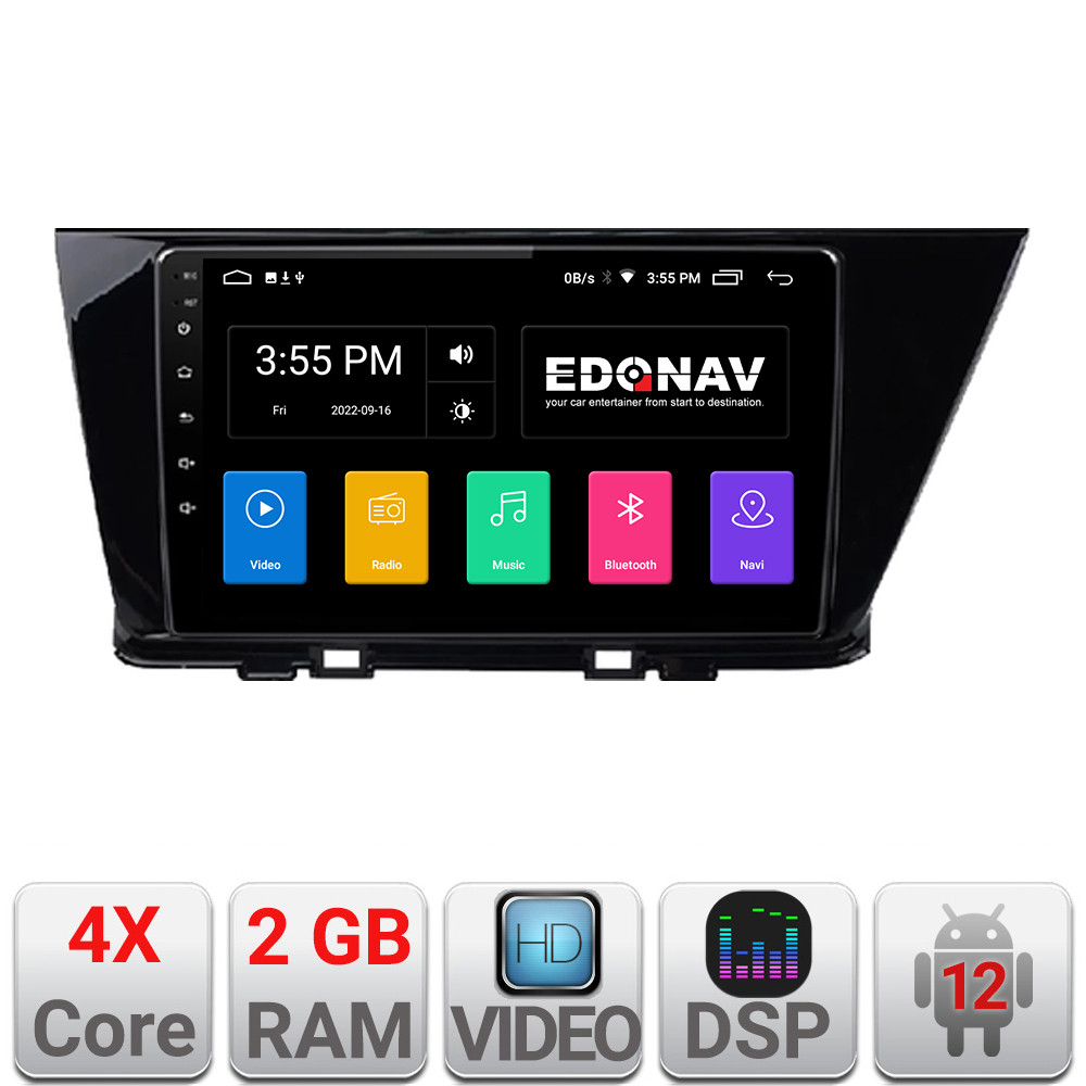 Cu sistem de operare Android 12, procesor 4xCore, Bluetooth încorporat, intrare USB, memorie internă 2GB, ecran tactil capacitiv, radio cu RDS, control comenzi volan, GPS și DSP integrate